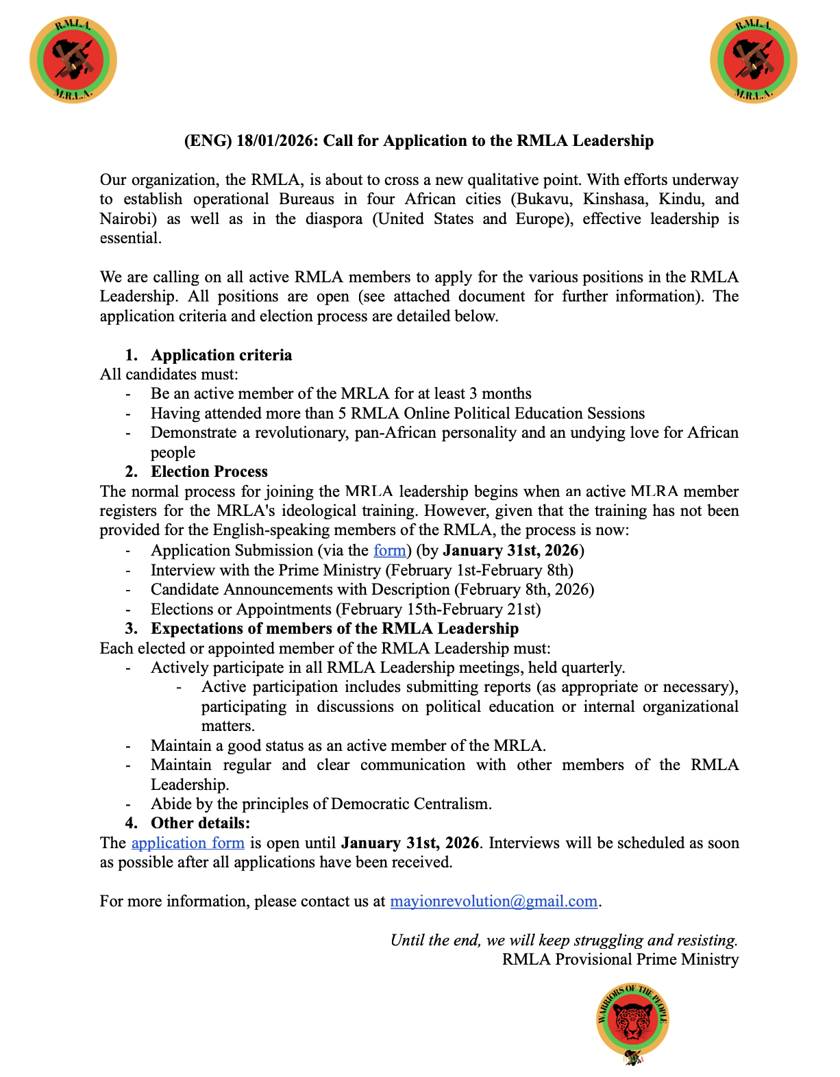 January 18th, 2028: Call for Application to the RMLA Leadership. Application Form. RMLA Provisional Prime Ministry