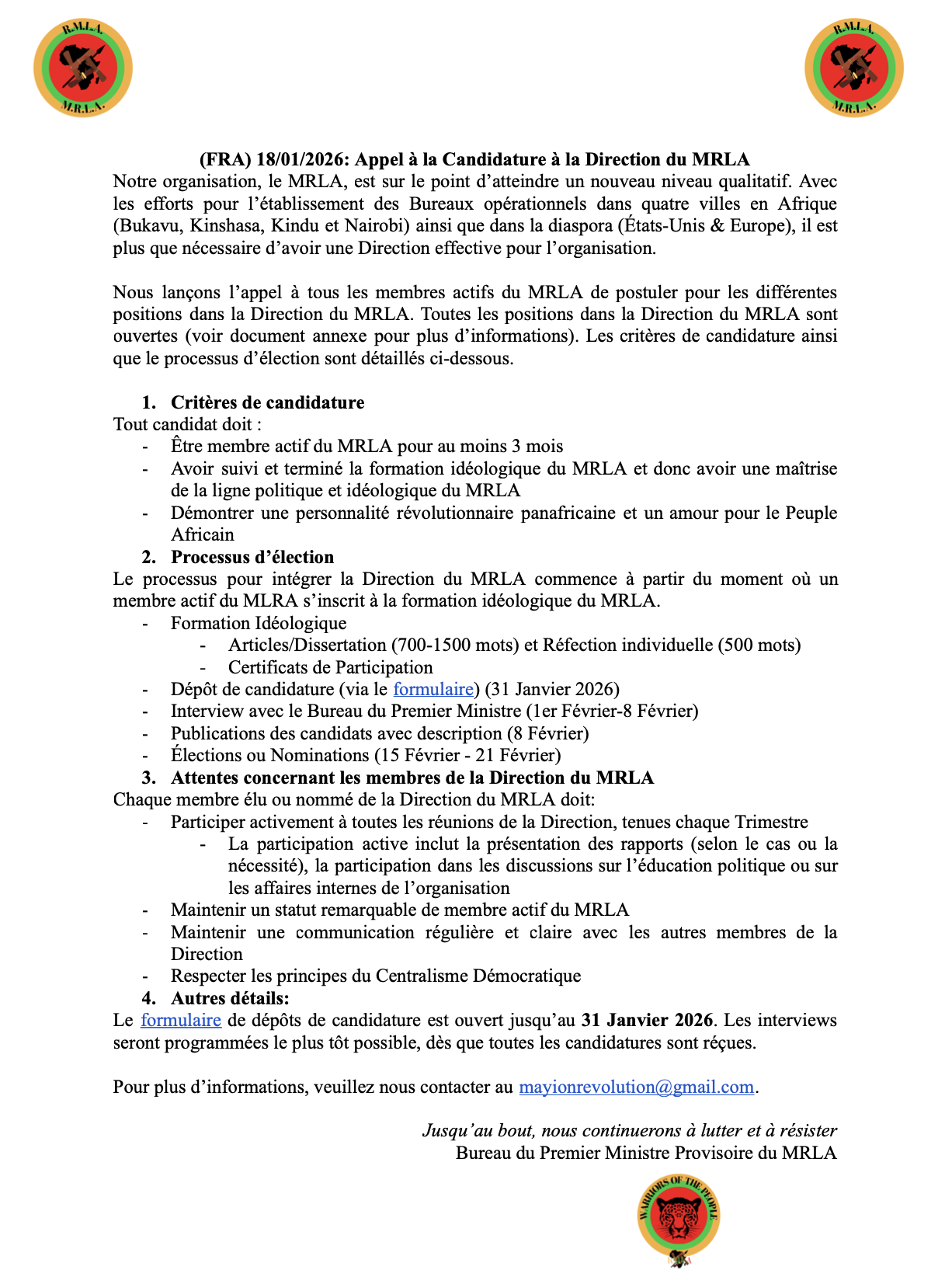 18 Janvier 2026: Appel à la Candidature à la Direction du MRLA. Formulaire de candidature. Bureau du Premier Ministre Provisoire